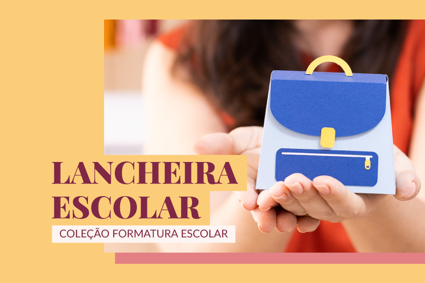 E é pra essa celebração que a gente lança hoje o kit Formatura Escolar, também conhecido como Formatura ABC, com vários itens que eu vou ensinar você a montar ao longo dos próximos dias. O primeiro modelo é a caixa bolsinha, repaginada, agora com cara de lancheira, e feita sem nenhuma impressão, totalmente em camadas.