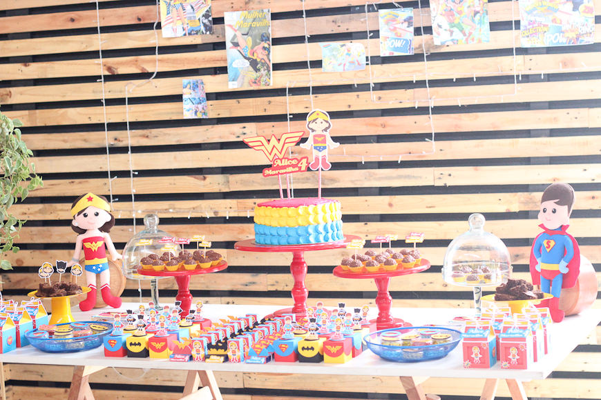 Agora se a comemoração for uma festa infantil e seu filho já tiver o tema escolhido, uma ótima opção é usar ilustrações estilizadas. Você pode encomendar um desenho dele vestido como seu super-herói preferido, ou então de sua pequena de princesa, e fazer uma festa temática diferente. Além disso, você pode usar muitas guloseimas na decoração da mesa principal, como pirulitos, latinhas de bala, chocolates embalados, balinhas em saquinhos, bisnagas e vidrinhos de brigadeiro. Opções não faltam.