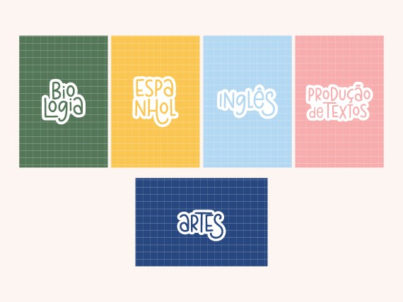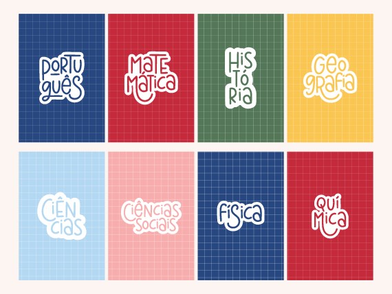 São 13 modelos de capas com o nome das matérias, 02 modelos de miolo e 1 modelo de cartela de adesivo.
