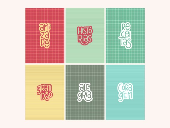 São 06 modelos de capas com palavras, 02 modelos de miolo e 1 modelo de cartela de adesivo.