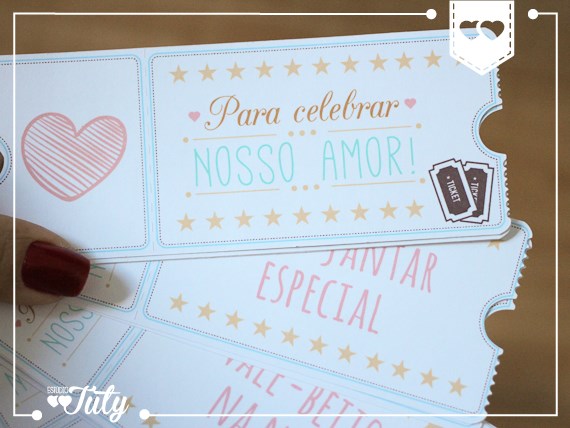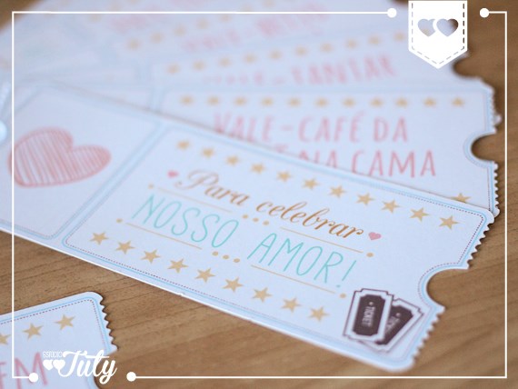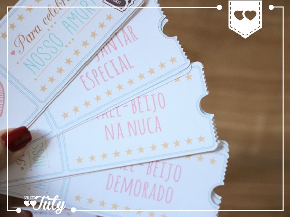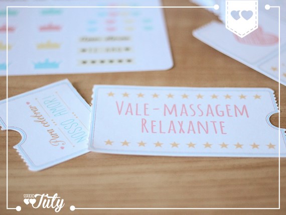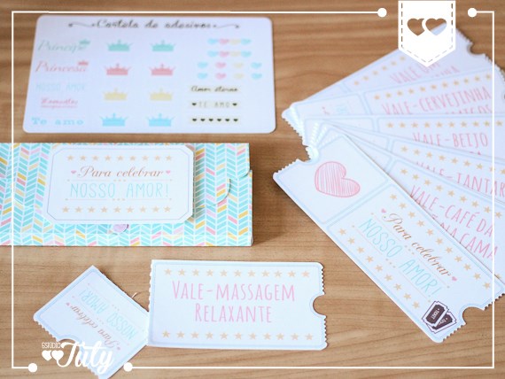 O kit Digital Vale Amor tem diversos arquivos para personalizar o presente do seu amor. Você poderá preparar uma caixinha com 12 diferentes mensagens de vale-carinho (que podem se repetir para deixar a caixinha super cheia) e uma cartela de adesivos super fofos.