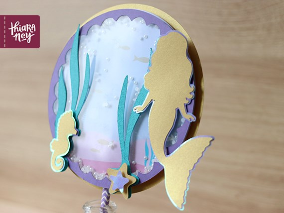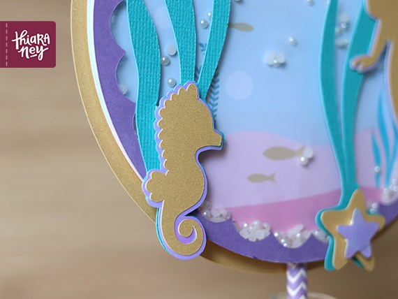 Offset Chambril 180g, Fotográfico Jato de Cera, Cardstock verde, Color Plus Amsterdã, Papel Relux Ouro, Papel Iridescente Azul, acetato de 20 micras, meia pérola, cola artesanal e fita banana picotada.