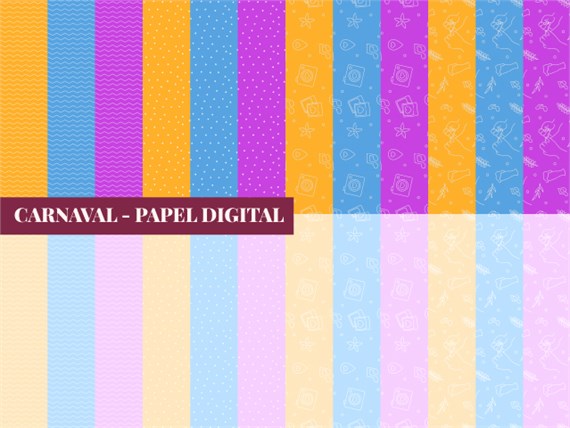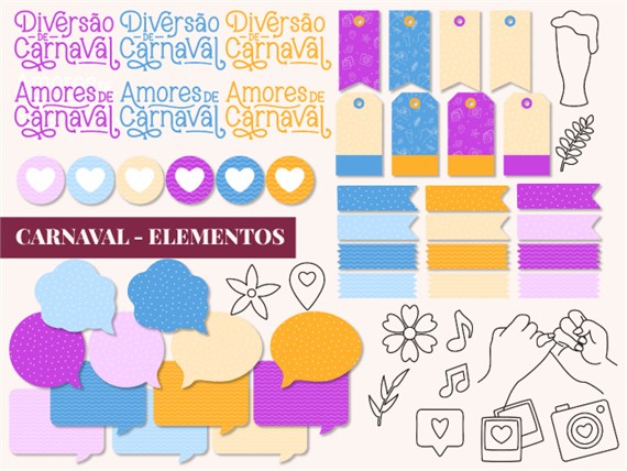 Kit Digital com elementos e papéis digitais coordenados para compor a festa no tema Carnaval. Com o kit digital você pode criar seus próprios projetos e personalizações para complementar os projetos já disponíveis.